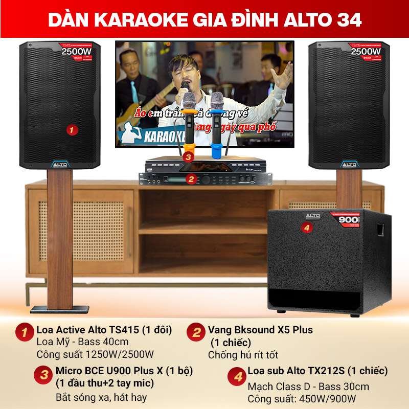 Dàn karaoke gia đình Alto 34 được xây dựng từ những thiết bị cao cấp Alto, BKSound, BCE hứa hẹn mang đến những màn giải trí chất tuyệt vời, âm thanh chi tiết, ngọt ngào.