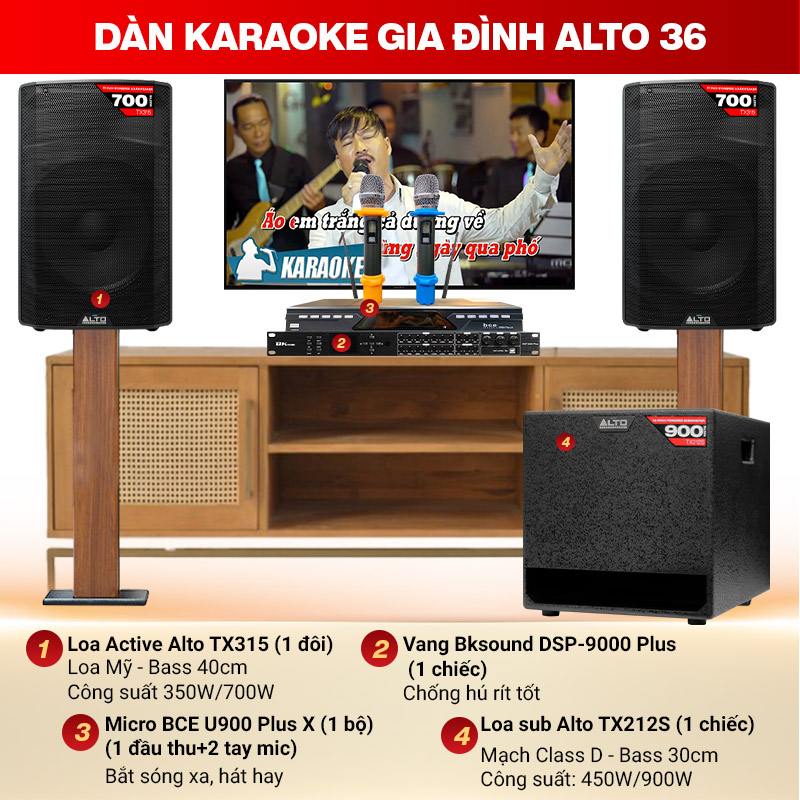 Dàn karaoke gia đình Alto 36 phù hợp để thiết kế cho phòng hát karaoke gia đình của các thương hiệu danh tiếng hàng đầu như Alto, BKSound, BCE hứa hẹn mang đến những màn trình diễn ấn tượng.