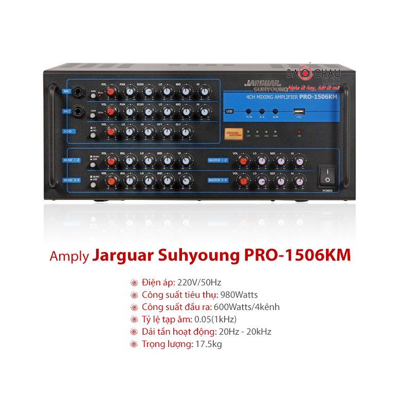 Amply Jarguar Suhyoung PRO-1506KM trang bị ECHO PRO nên mang tới âm sắc rõ ràng và mượt mà, giúp cho quý khách hàng có được những trải nghiệm tuyệt vời kể cả khi hát karaoke lẫn nghe nhạc. Ngoài ra với cổng USB ở mặt trước nên bạn có thể phát nhạc hay hát những bài hát mình ưa thích mà không phải mất thêm kinh phí để mua đầu đĩa.