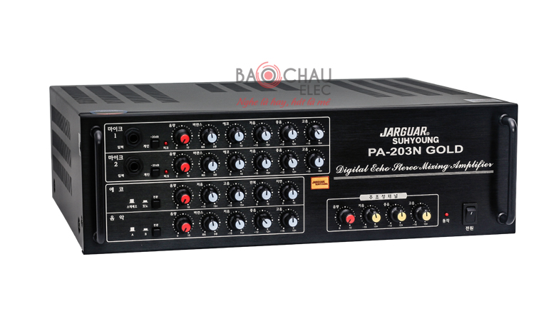 Amply Jarguar Suhyoung PA-203N Gold có công suất 300W x 2CH giúp tạo ra những âm thanh mạnh mẽ, thỏa mãn nhu cầu chơi loa công suất lớn của bạn.