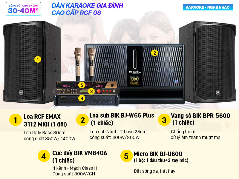 Bạn là người yêu thích âm nhạc chất lượng hãy tham khảo Dàn karaoke gia đình cao cấp RCF 08. Bộ dàn được phối ghép từ các thiết bị âm nhạc đến từ các thương hiệu RCF, BIK, ALTO, BCE đáp ứng cả tính thẩm mỹ và khả năng hát karaoke, nghe nhạc tuyệt vời.
