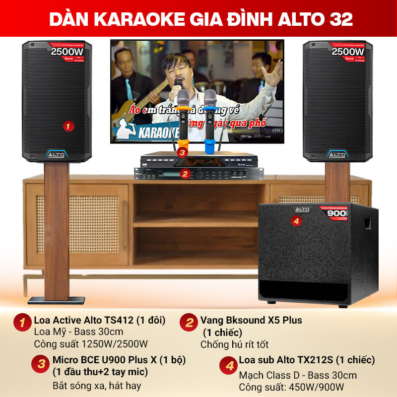 Dàn karaoke gia đình Alto 32 được tạo nên từ những thương hiệu âm thanh danh tiếng như Alto, BCE, BKSound. Mẫu dàn karaoke này mang đến những màn trình diễn sống động, âm thanh chân thực, sắc nét mang lại những trải nghiệm tuyệt vời.
