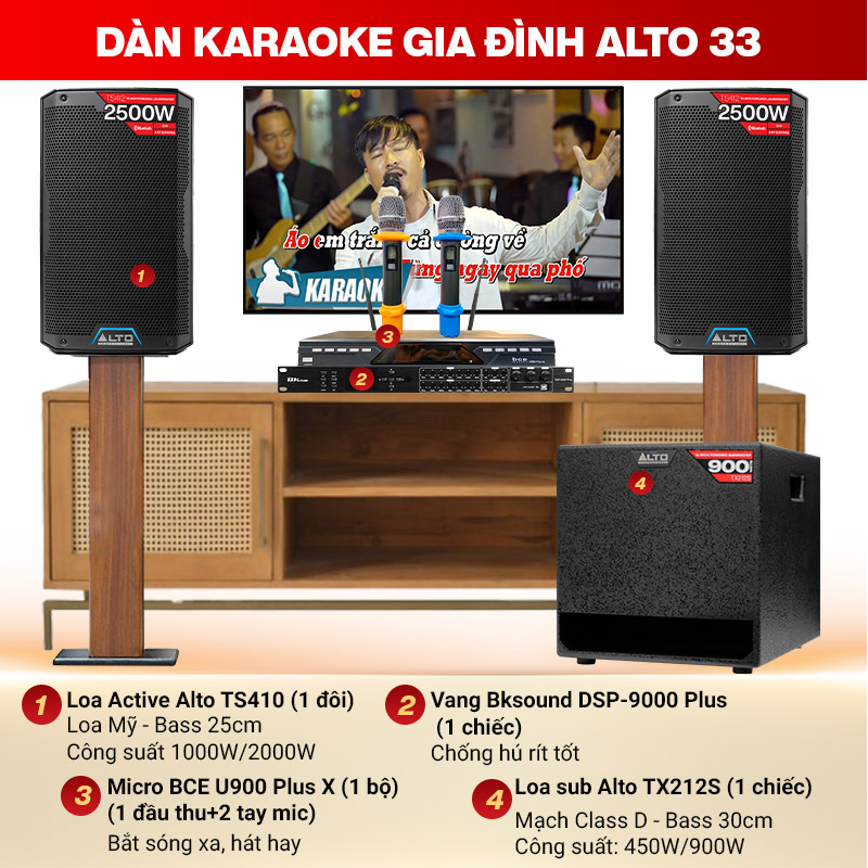 Dàn karaoke gia đình Alto 33 là bộ dàn chất lượng cao gồm các thiết bị đến từ những thương hiệu âm thanh danh tiếng nhất như Alto, BKSound, BCE hứa hẹn mang lại những màn trình diễn âm thanh sống động trên toàn dải tần.