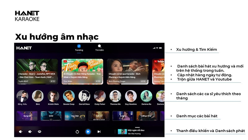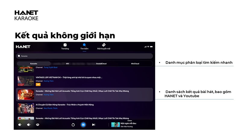 Máy tính bảng Hanet Smartlist 2 sẽ hiển thị danh mục phân loại tìm kiếm nhanh, gồm cả danh sách kết quả bài hát trên Hanet và Youtube.