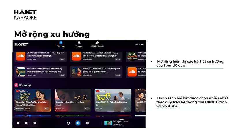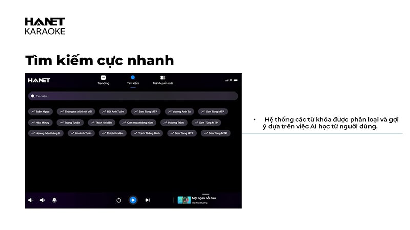 Hanet Smart List 2 với khả năng phân tích thói quen, sở thích của người dùng sẽ tự đưa ra đề xuất bài hát phù hợp. Nếu bạn không nhớ tên bài hát, hay tên ca sĩ, đừng lo vì tính năng này cho phép bạn dễ dàng chọn lựa những bài hát tủ của mình đã lâu không hát.