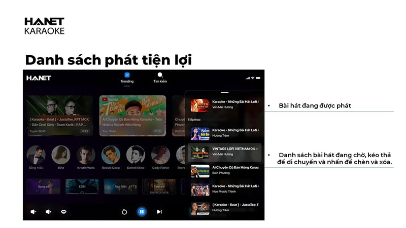 Hanet Smartlist 2 hiển thị một cách rõ ràng, khoa học các mục danh sách bài hát đang được phát, danh sách bài hát chờ, người dùng chỉ cần sử dụng thao tác kéo thả để di chuyển hoặc nhấn đè để đèn và xóa vô cùng dễ dàng.