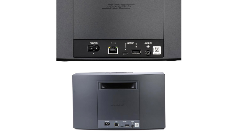 Mặt sau là lỗ thông hơi, cổng nguồn, Ethernet port, cổng microUSB, cổng USB và A-in. Đi kèm bộ loa Bose Soundtouch 20 III này là một remote đầy đủ chức năng với bề mặt là nhựa mềm.