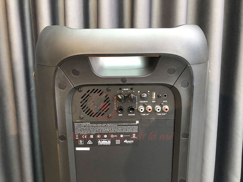 Các cổng kết nối như RCA, 3.5mm, USB, cổng mic, cổng nhạc cụ 2 núm chỉnh âm lượng,… đều được dồn hết vào mặt sau loa.