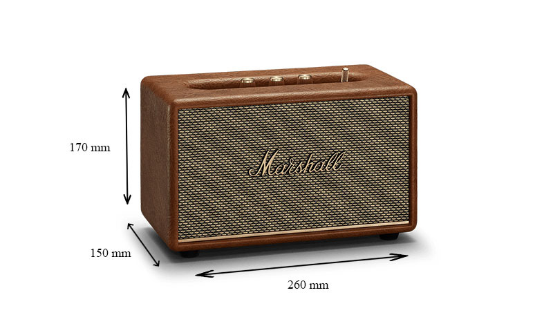 Loa bluetooth này nhỏ gọn với kích thước 260 x 170 x 150 mm cùng trọng lượng nhẹ 2,85kg cực kỳ tiện lợi mang đi bất cứ nơi nào bạn muốn. Thiết kế của Marshall Acton 3 ngoài các nút điều chỉnh âm lượng, âm trầm, bổng và nút nguồn thì thiết bị còn có nút điều khiển Knob dừng, tua nhanh bài hát tiện lợi. Tất cả các nút chức năng đều được làm bằng đồng, mang đến tác dụng trang trí sản phẩm thêm phần nổi bật, hiện đại.