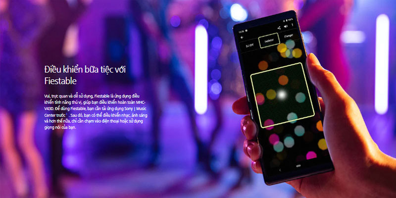 Loa bluetooth Sony MHC V13 có hiệu ứng đèn LED thay đổi nhịp nhàng với nhiều màu sắc rực rỡ theo âm nhạc. Nếu chất âm bùng nổ sẽ mang lại cho bạn không gian chuyên nghiệp như đang trong bar, club...Tích hợp thêm ứng dụng Fiestable nên bạn hoàn toàn có thể kiểm soát màu sắc hoặc kích hoạt chế độ DJ, karaoke, thay đổi, điều chỉnh đơn giản bằng động tác vẫy cổ tay. Với ứng dụng Sony | Music Center độc quyền, bạn hoàn toàn có thể điều khiển cài đặt nhạc và ánh sáng tùy thích ngay từ điện thoại của mình.