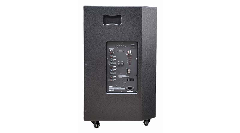 Mặt sau loa là các cổng kết nối và điều chỉnh loa. Ngoài ra còn được thiết kế chỗ để xách, kéo loa đi dễ dàng. Phía dưới chân loa được trang bị các bánh xe giúp cho việc kéo đi, di chuyển dễ dàng nhất có thể.