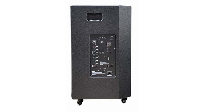 Logo nổi bật trên lưới phía trước loa bass gây ấn tượng mạnh và thu hút người nhìn. Mặt sau loa là các cổng kết nối và điều chỉnh loa. Ngoài ra còn được thiết kế hốc để xách, kéo loa đi dễ dàng. Phía dưới chân loa được trang bị các bánh xe giúp cho việc kéo đi, di chuyển dễ dàng nhất có thể.