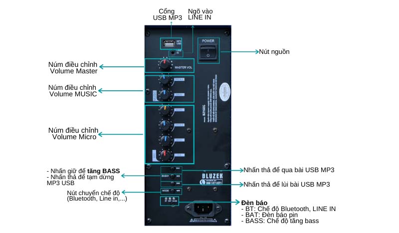 Để giúp người dùng dễ sử dụng nhất, loa được thiết kế 1 bảng điều khiển gồm các nút điều chỉnh được chú thích rõ ràng. Bluzek BZ15EG còn được trang bị Pin Lithium-ion giúp nâng cao tuổi thọ, không lo kiệt pin nếu chậm sạc, số lần sạc xả cao gấp nhiều lần.