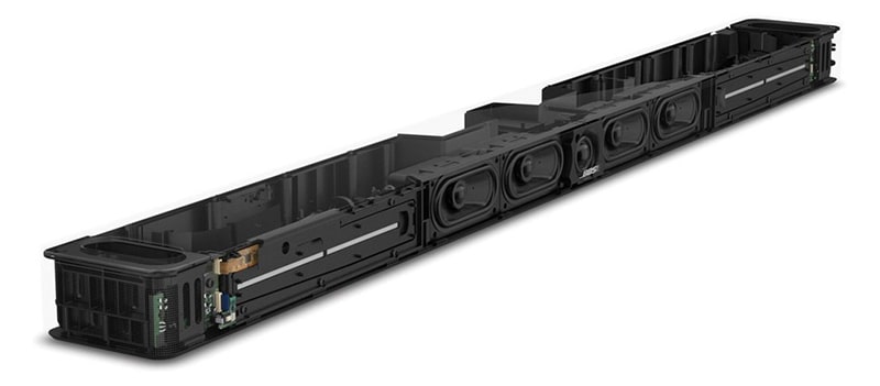 Loa Bose Smart Soundbar 900 có hệ thống củ loa ấn tượng với 4 loa woofer racetrack chia đều cho kênh trái và phải, 1 củ tweeter ở giữa và 2 củ loa lưỡng cực hướng trần giúp loa tái tạo âm thanh đầy đủ và chi tiết mọi dải tần.