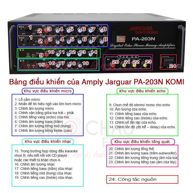 Amply Jarguar Suhyoung PA-203N là một thiết bị âm thanh rất được ưa chuộng phổ biến trong hệ thống karaoke gia đình tại Việt Nam. Tuy nhiên, để khai thác tối đa hiệu quả của thiết bị này, mang đến trải nghiệm ca hát thực sự thăng hoa việc chỉnh amply Jarguar một cách chuẩn xác là cực kỳ quan trọng. Trong bài viết sau hãy cùng Bảo Châu Elec chia sẻ những kinh nghiệm thực tế cách chỉnh Amply Jarguar 203N hát karaoke cực hay đơn giản tại nhà.