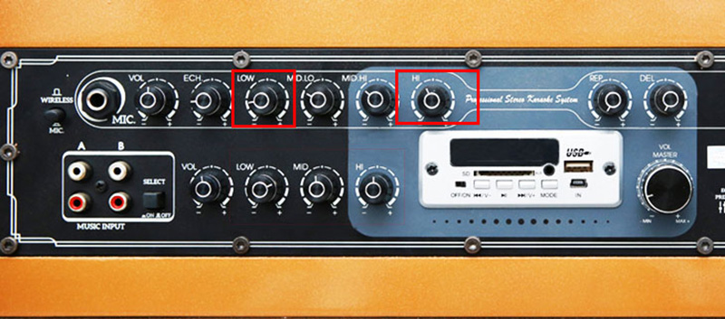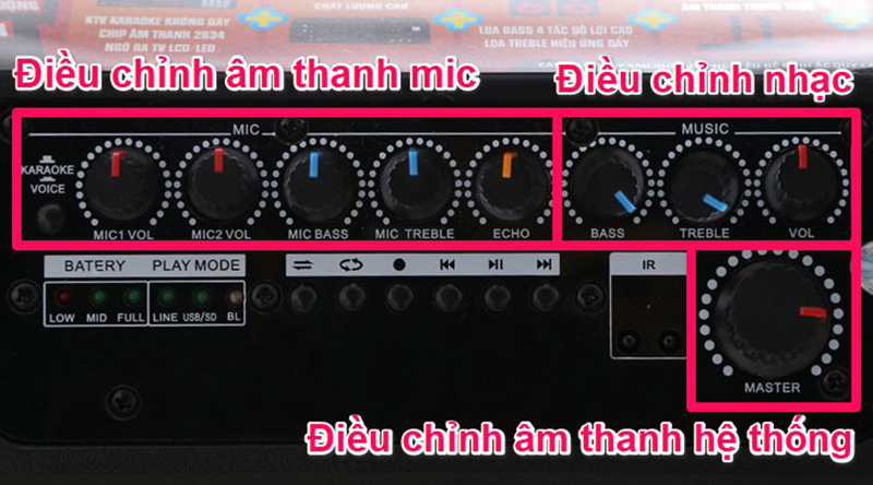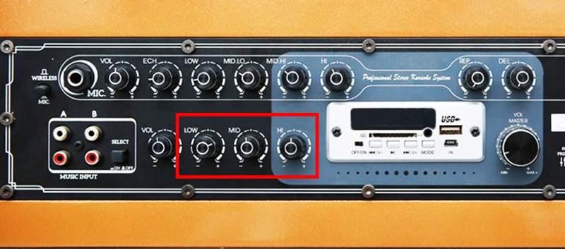 Sau đó, tiến hành chỉnh theo đúng thứ tự: micro → nhạc → hệ thống loa. Lưu ý rằng mỗi hãng loa có thể bố trí nút khác nhau, nhưng nhìn chung đều xoay quanh 3 nhóm chỉnh cơ bản này.