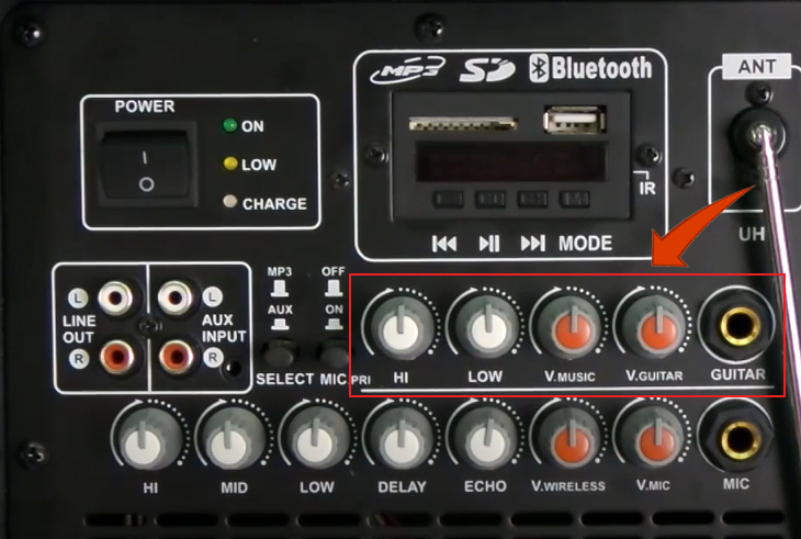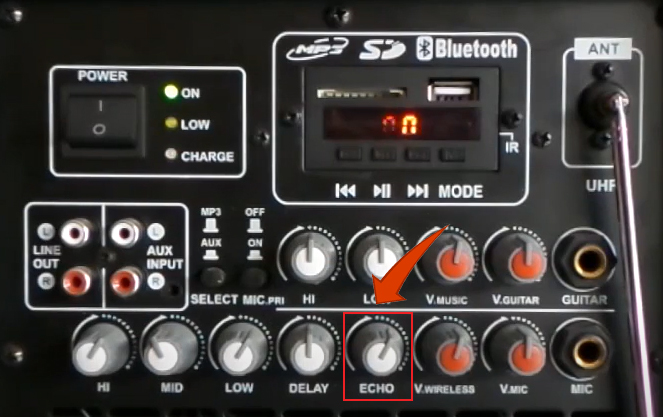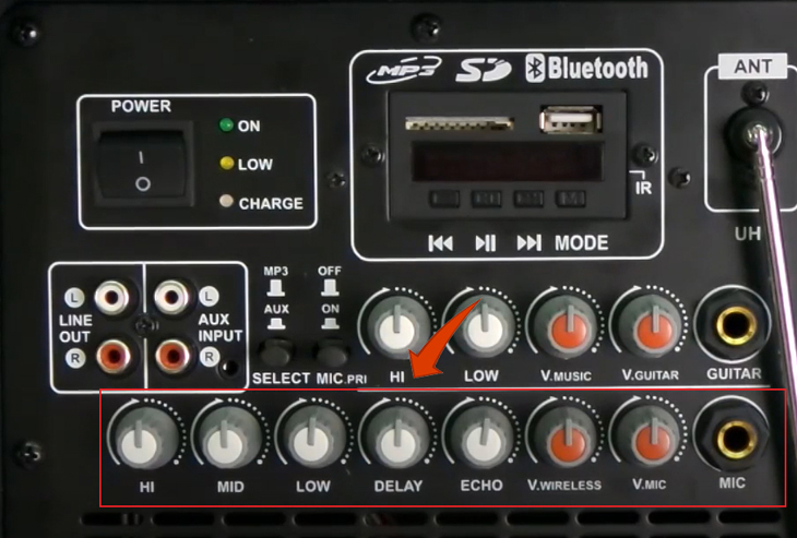 Trước tiên, hãy vặn tất cả các nút điều chỉnh (HI, MID, LOW, ECHO, DELAY) về vị trí trung tâm (hướng 12 giờ) và hạ toàn bộ các nút âm lượng xuống mức thấp nhất.