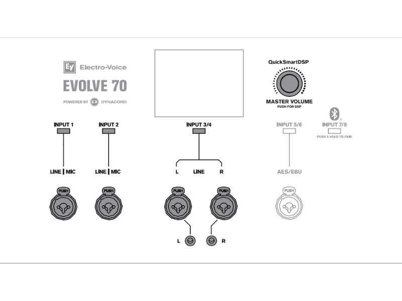 Bộ khuếch đại tích hợp DSP của hệ thống loa EV Evolve được thiết kế với nhiều cổng kết nối và nút điều khiển, đảm bảo khả năng sử dụng linh hoạt trong nhiều tình huống âm thanh khác nhau.