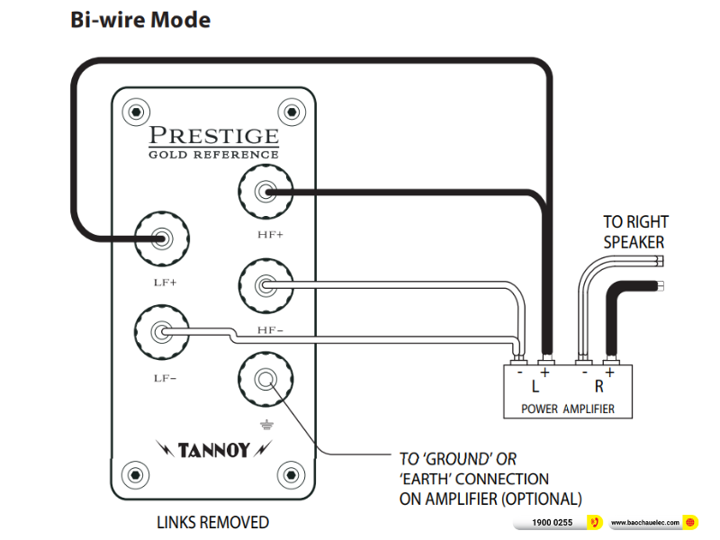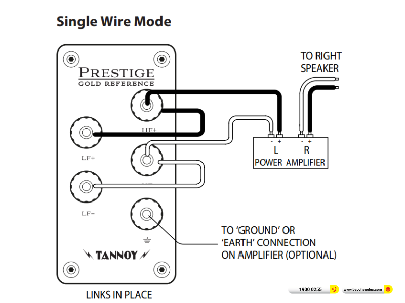 Trong chế độ này, bạn sử dụng các cầu nối có sẵn để nối giữa cọc HF+ với LF+ và HF- với LF- trên mỗi loa. Sau đó, kết nối dây loa từ ampli đến cọc HF của từng loa, đảm bảo cực dương (+) trên ampli được nối với cực dương của loa và tương tự với cực âm (-). Thực hiện tương tự với cả loa trái và loa phải.