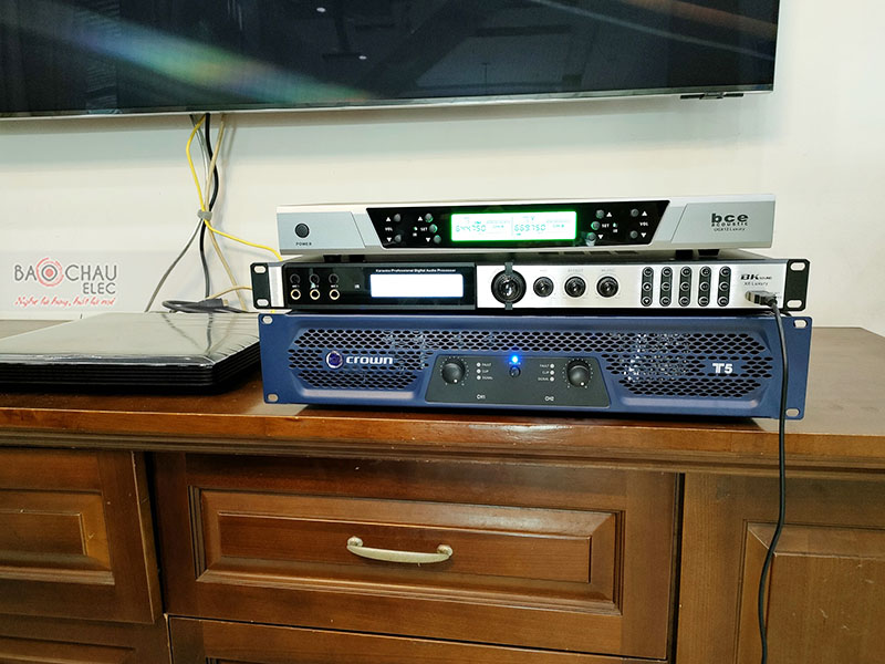Cùng với chiếc cục đẩy Crown T5 có khả năng hoạt động bền bỉ ở công suất cao, phối ghép dễ dàng, âm thanh nổi hoàn hảo, khuếch đại âm thanh với công suất mạnh mẽ, uy lực. Kết hợp cùng vang số BKSound X6 Luxury đóng vai trò chống hú rít, khuếch đại và xử lý âm thanh ra loa hay nhất.