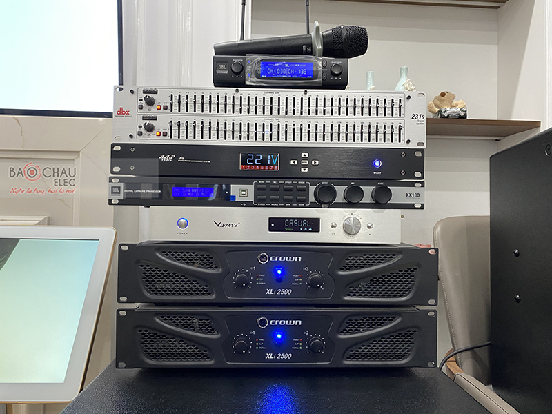 2 chiếc cục đẩy công suất Crown Xli2500 làm nhiệm vụ khuếch đại âm thanh đảm bảo công suất thêm mạnh mẽ, chân thực. Kết hợp cùng vang số JBL KX180 xử lý âm thanh ra loa mượt mà, trong trẻo ra loa.