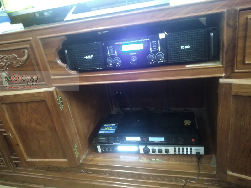 Cục đẩy công suất AAP TD8004 kết hợp cùng vang số BKSound X6 Luxury khuếch đại, xử lý âm thanh ra loa cực hay.