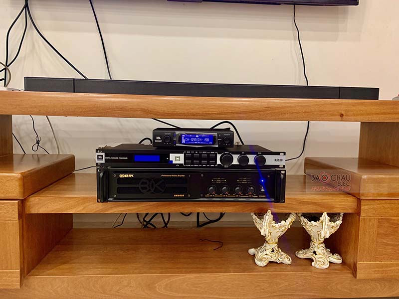 Cục đẩy công suất BIK VM840A làm nhiệm vụ khuếch đại âm thanh đảm bảo công suất thêm mạnh mẽ, chân thực. Kết hợp cùng vang số JBL KX180 xử lý âm thanh ra loa mượt mà, trong trẻo ra loa.