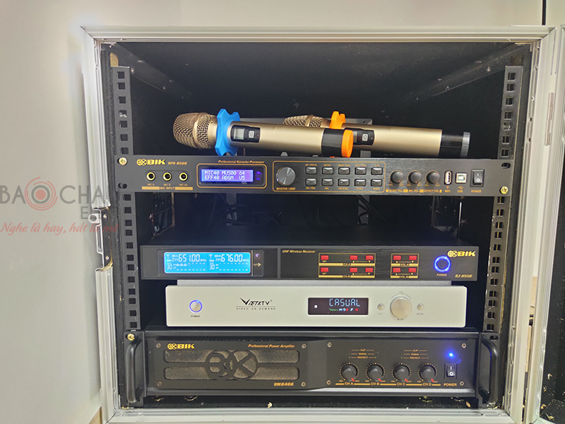 Cục đẩy công suất BIK VM820A cho khả năng khuếch đại chất âm mạnh mẽ, sống động. Kết hợp cùng vang số BIK BPR-8500 xử lý âm thanh mượt mà, hoàn hảo ra loa. Loa sub BIK BJ-W66 Plus cho chất âm mạnh mẽ, thích hợp với nhiều thể loại âm thanh từ sống động.