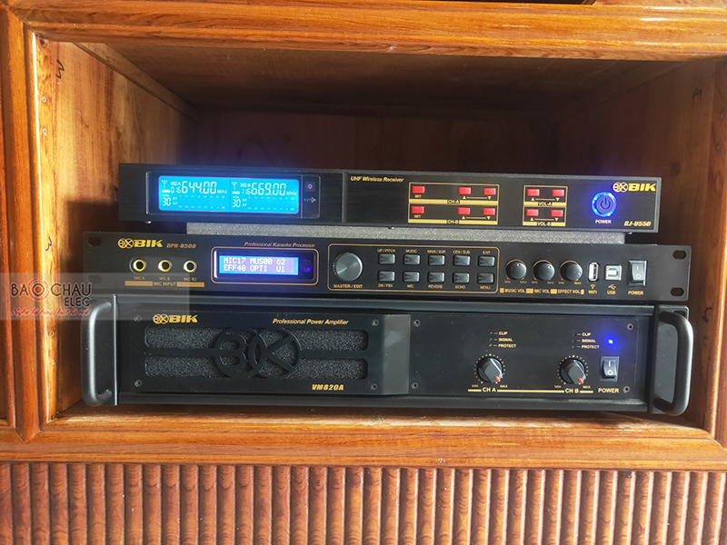 Cục đẩy công suất BIK VM820A khuếch đại chất âm mạnh mẽ, sống động. Kết hợp cùng vang số BIK BPR-8500 xử lý âm thanh mượt mà, hoàn hảo ra loa.