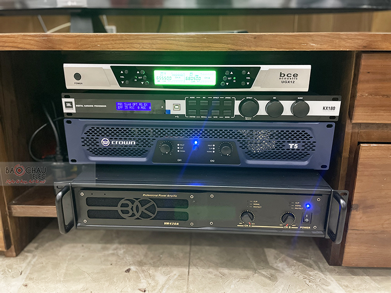 Sự kết hợp của 2 chiếc cục đẩy công suất Crown T5 và cục đẩy công suất BIK VM420A giúp khuếch đại âm thanh mạnh mẽ, bùng nổ. Kết hợp cùng vang số cao cấp JBL KX180 xử lý âm thanh ra loa hay nhất cho bộ dàn karaoke sử dụng.
