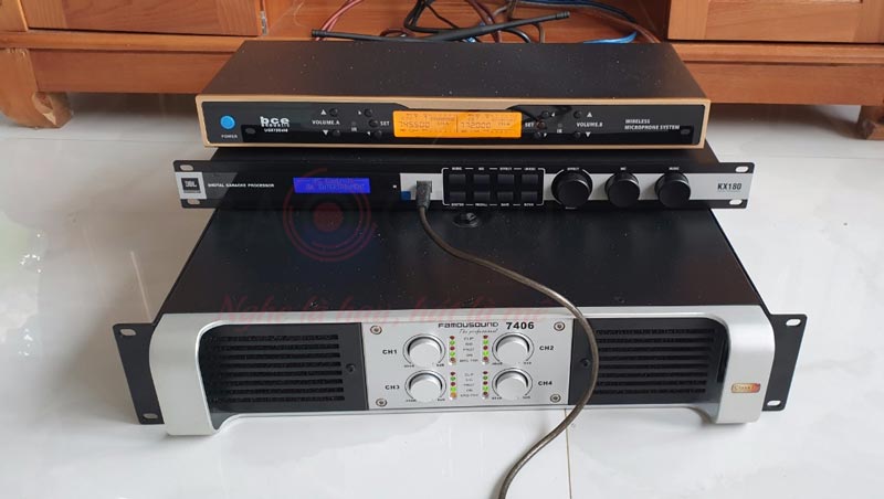 Đây là trung tâm đầu não của cả bộ dàn với: Cục đẩy công suất Famousound 4 kênh 7406 sẽ giúp kéo 2 đôi loa và 1 cục đẩy 5 tấc đơn giản. Vang số JBL KX180 giúp kiểm soát toàn bộ âm thanh của bộ dàn từ khử hú rít, chỉnh âm, cắt tần số cho loa chính và sub chuẩn xác, bảo vệ loa,... Tiếp đó là micro karaoke không dây cực hay BCE UGX12 Gold sóng khỏe, cực nhẹ, lọc âm hay và nhiều cảm biến hiện đại.