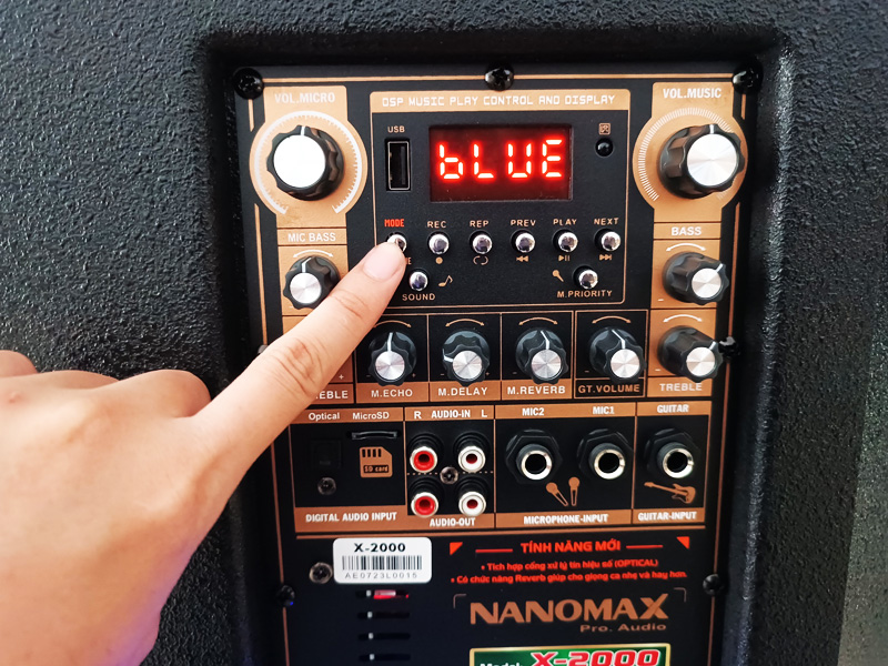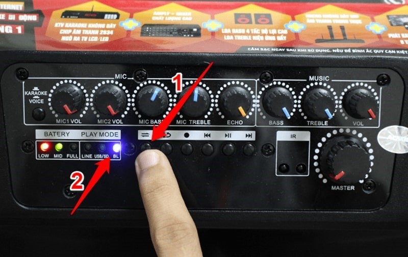=>> Giải pháp: Người dùng cần đảm bảo đã kích hoạt đúng chế độ Bluetooth. Hãy tìm và nhấn nút "MODE" (hoặc "Input") trên bảng điều khiển cho đến khi màn hình LED hiển thị chữ "BLUE" hoặc biểu tượng Bluetooth tương ứng.