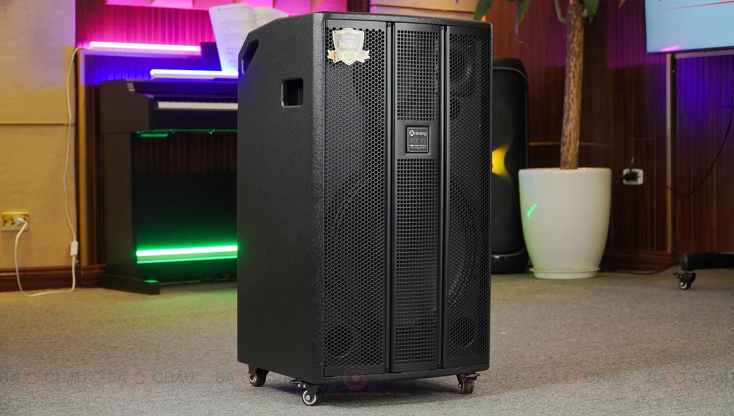 Công nghệ DSP digital cho âm thanh chi tiết, hạn chế méo tiếng khi hát lớn. Đi kèm là 2 micro không dây UHF vỏ kim loại, hút âm tốt, chống hú hiệu quả. Thiết kế dạng vali kéo, bánh xe lớn giúp di chuyển cực kỳ dễ dàng. Pin sử dụng 4–5 giờ liên tục, đủ cho các buổi tiệc mini ngoài trời.