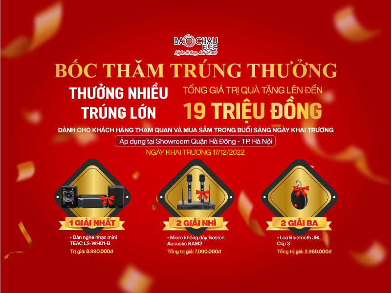 9h30 sáng ngày khai trương 17/12/2022, tại Bảo Châu Elec Hà Đông sẽ diễn ra Chương trình bốc thăm trúng thưởng dành cho khách tham quan và mua hàng tại showroom bao gồm các phần quà giá trị và hấp dẫn sau: