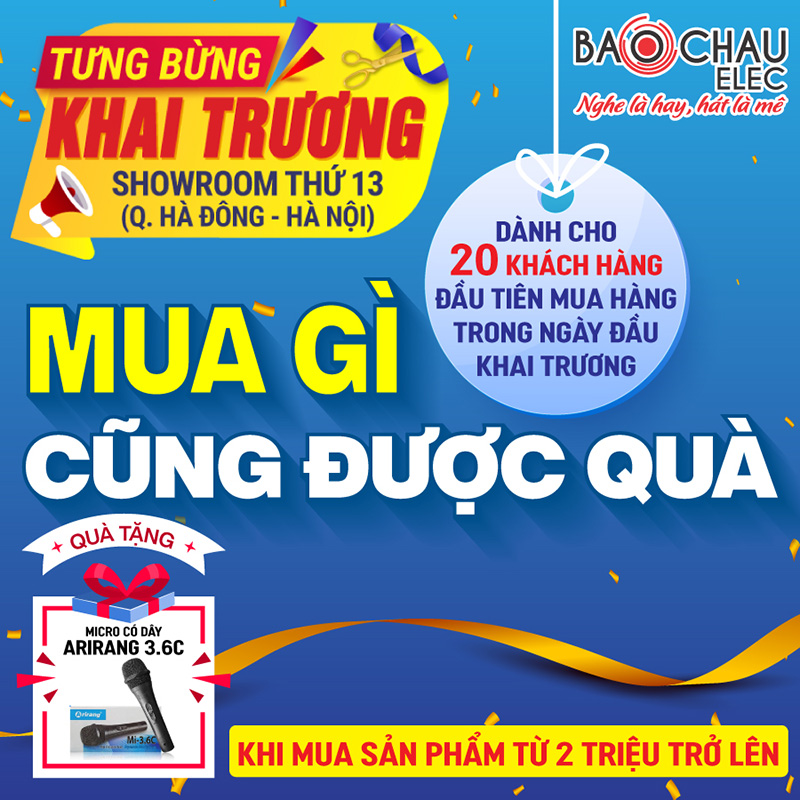 Ngoài ra, Bảo Châu Elec còn mang đến vô vàn quà tặng ưu đãi đang chờ đón khách hàng khi mua tại shop khai trương. Mua gì cũng có quà với mỗi sản phẩm từ 2 triệu trở lên tặng 1 micro Ariang 3.6C (Số lượng có hạn chỉ 20 chiếc).