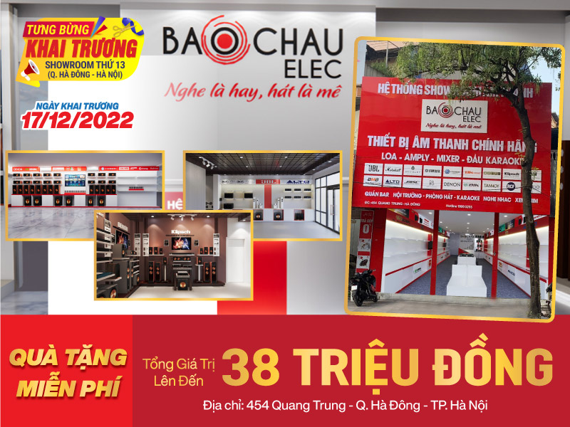Nhằm mang đến cho quý khách hàng mọi miền đất nước những thiết bị âm thanh chất lượng và chính hãng, chúng tôi xin trân trọng thông báo sẽ khai trương Bảo Châu Elec Hà Đông - Hà Nội vào ngày 17/12/2022 tại địa chỉ 454 Quang Trung - Hà Đông. Đây là showroom thứ 13 thuộc hệ thống showroom Bảo Châu Elec và là showroom thứ 3 tại Hà Nội.