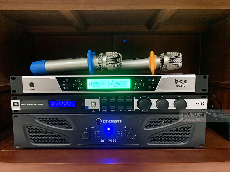 Cục đẩy công suất Crown Xli 2500 có khả năng hoạt động mạnh mẽ, mang đến năng lượng tuyệt vời cho hệ thống âm thanh. Vang số cao cấp JBL KX180 giúp khuếch đại và xử lý âm thanh ra loa hay nhất cho bộ dàn karaoke sử dụng. Kết hợp với micro không dây BCE UGX12 mang đến hệ thống karaoke tuyệt vời nhất.