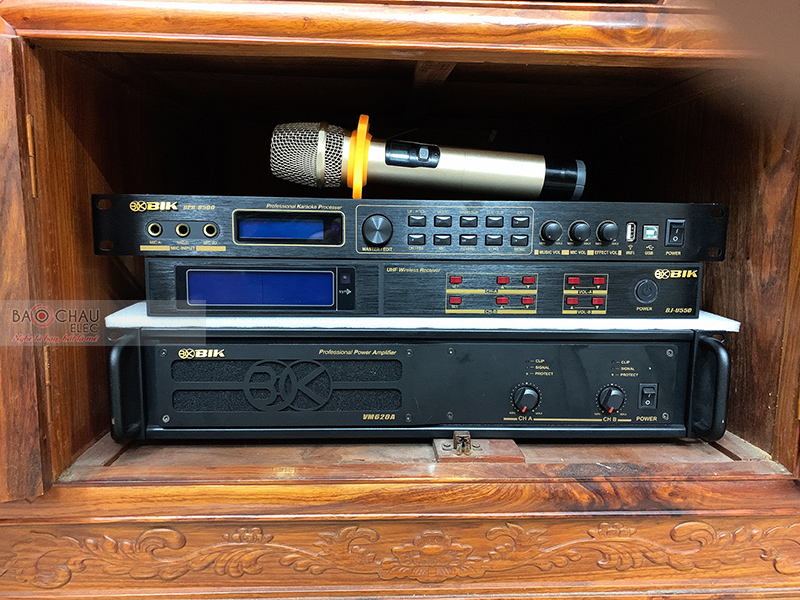 Cục đẩy công suất 2 kênh BIK VM620A hoạt động mạnh mẽ, mang đến năng lượng tuyệt vời cho hệ thống âm thanh. Vang số đồng bộ BIK, BIK BPr-8500 đóng vai trò chống hú rít, khuếch đại và xử lý âm thanh ra loa hay nhất cho bộ dàn karaoke gia đình sử dụng, micro không dây BIK BJ-U550 hát nhẹ, hút âm, mang đến trải nghiệm âm nhạc tuyệt vời.