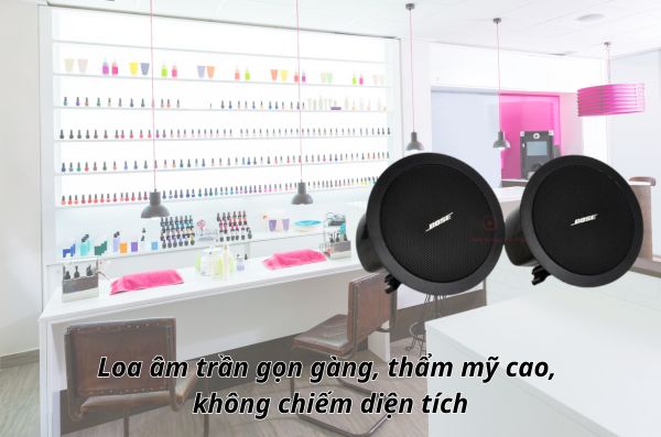 Đối với những tiệm nail có diện tích nhỏ hoặc trần thấp, loa âm trần là giải pháp lý tưởng vì không chiếm diện tích sàn, không vướng dây dẫn hay chân loa. Không gian nhờ đó trở nên gọn gàng, sang trọng và chuyên nghiệp hơn, đúng với phong cách spa – salon hiện đại.